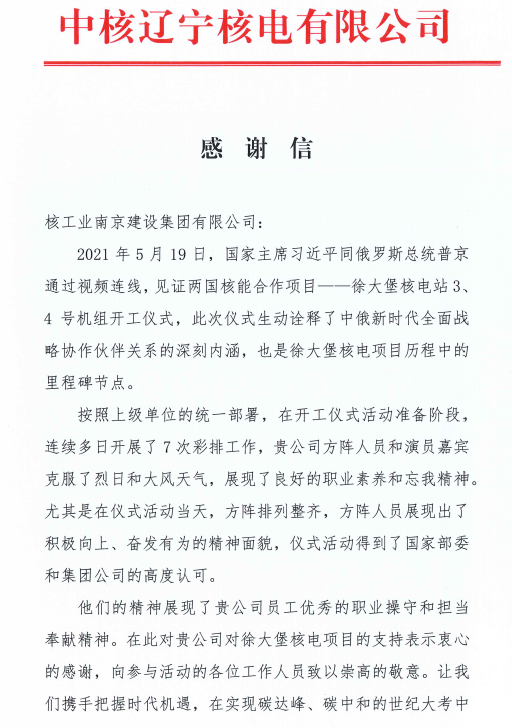 二七二队在以经济效益为结果导向的同时,开展以“传承、创新、诚信、卓越”为核心的企业文化建设,强化服务意识,注重社会效益,实现核工南京品牌价值不断提升。2021年5月18日,中俄两国元首共同见证徐大堡核电3、4号机组和田湾核电7、8号机组开工建设的活动过程中,二七二队徐大堡核电项目部在保证项目安全、顺利开展的前提下,积极配合辽宁核电完成活动中的一系列筹备工作,并得到辽宁核电的书面表扬。中俄两国元首见证开工仪式活动前,项目部成员连续多日顶着烈日大风天气,以良好职业素养和忘我精神开展了7次彩排,仪式当天充分展现出积极向上、奋发有为的的精神面貌,受到国家部委和中核集团高度认可。