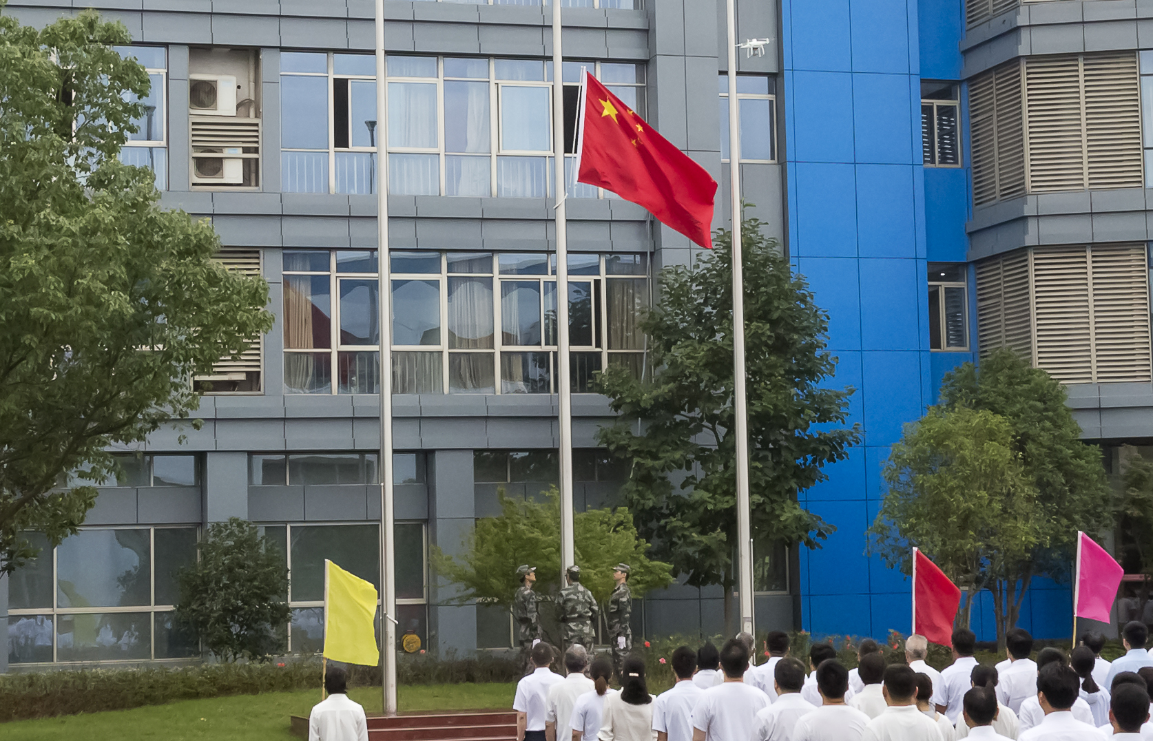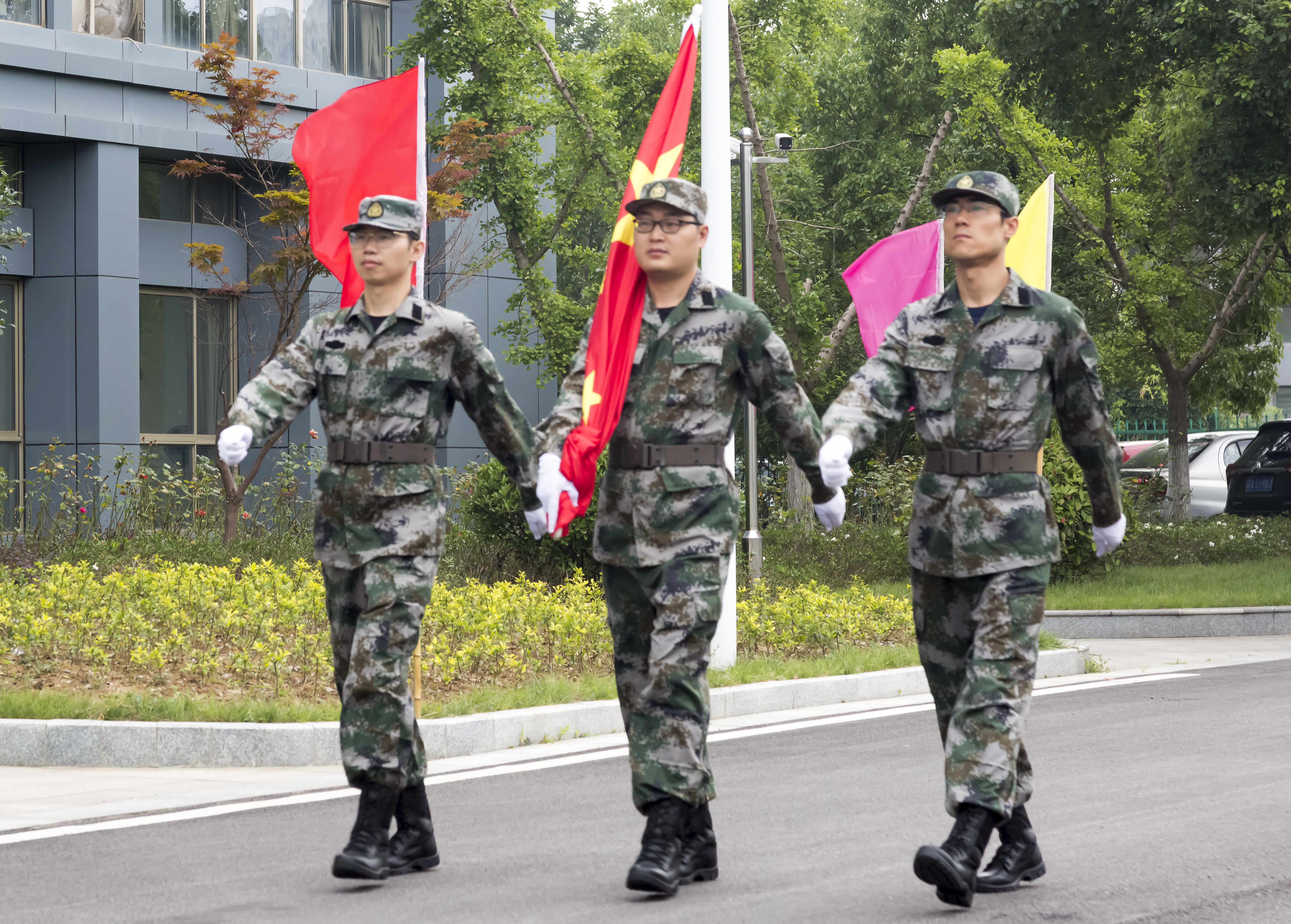上午9时,升旗仪式开始。我队训练多日的国旗护卫队踏着坚毅而有力的步伐正步而出,护送鲜艳的五星红旗进场,在雄壮的国歌声中,五星红旗冉冉升起,迎风飘扬。现场所有人员庄严肃立,向国旗行注目礼,共同祝愿伟大的祖国更加繁荣昌盛。